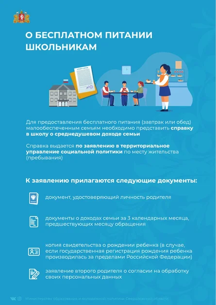 Для предоставления бесплатного питания (завтрак или обед) малообеспеченным семьям необходимо представить справку в школу о среднедушевом доходе семьи.